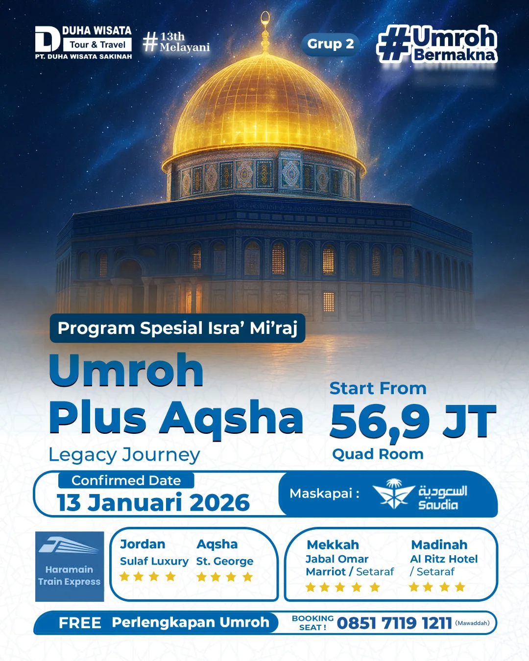 Nikmati pengalaman spiritual yang tak terlupakan bersama Program Umroh Plus Aqsha 2026 dari Duha Wisata. Dalam perjalanan berdurasi 15 hari, jamaah akan menunaikan ibadah umroh di Tanah Suci sekaligus berziarah ke Masjidil Aqsha, Amman, dan Petra — tiga destinasi bersejarah yang sarat makna dalam perjalanan iman umat Islam.